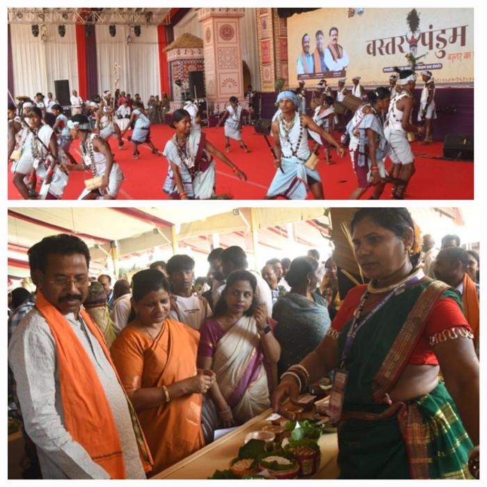 बस्तर पंडुम महोत्सव के आयोजन में पहले दिन बुधवार देर रात्री तक चले कार्यक्रम में बस्तर संभाग के सभी सातों जिलों से पंहुचे आदिवासी कलाकार अपनी विरासतन कई विधाओं का प्रर्दशन कर लाेगाें काे मंत्रमुग्ध किया। इस दाैरान दंतेवाड़ा विधायक चैतराम अटामी ने सुकमा, बीजापुर, दंतेवाड़ा, बस्तर, कोंडागांव, नारायणपुर एवं कांकेर के जनजातीय टीमों के स्टॉलों का अवलाेकन भी किया। अन्य राज्य जैसे ओडिशा, तेलंगाना, असम, कर्नाटक, आंध्र प्रदेश और मध्यप्रदेश के अदिवासी सांस्कृतिक दलों की टुकड़ियां भी यहां पहुंच चुकी हैं, जिनकी प्रस्तुति तय कार्यक्रम के अनुसार हाेगी।