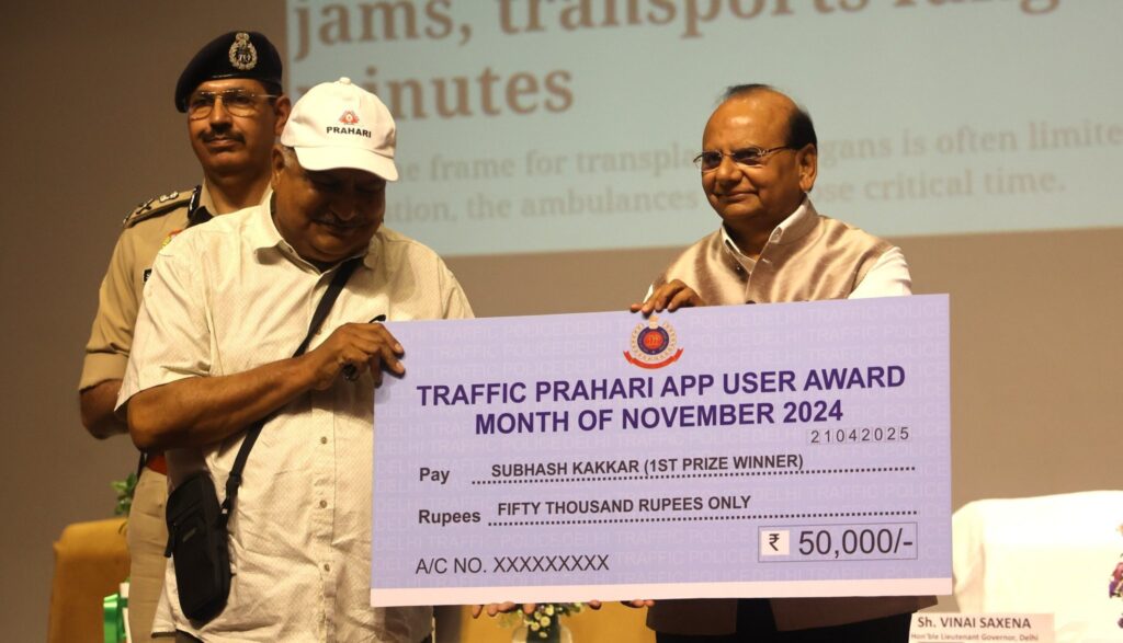 “ट्रैफिक प्रहरी योजना” के तहत सितंबर 2024 से यातायात प्रबंधन में दिल्ली पुलिस की सहायता करने के लिए यह पुरस्कार दिया गया है। ट्रैफिक प्रहरी यातायात उल्लंघनों की रिपोर्टिंग के माध्यम से अर्जित अंकों के आधार पर प्रति माह प्रथम स्थान के लिए 50,000 रुपये, दूसरे के लिए 25,000 रुपये, तीसरे के लिए 15,000 रुपये और चौथे के लिए 10,000 रुपये के पुरस्कार से पुरस्कृत किया गया।