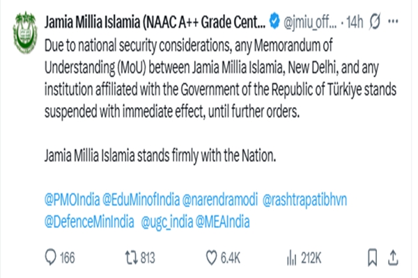 जवाहरलाल नेहरू विश्वविद्यालय (जेएनयू) के बाद जामिया मिलिया इस्लामिया ने तुर्की सरकार से संबद्ध संस्थानों के साथ सभी समझौता ज्ञापनों (एमओयू) को तत्काल निलंबित करने की घोषणा की है। सोशल मीडिया पर पोस्ट किए गए एक पोस्ट में जामिया ने कहा, “हम राष्ट्र के साथ मजबूती से खड़े हैं।