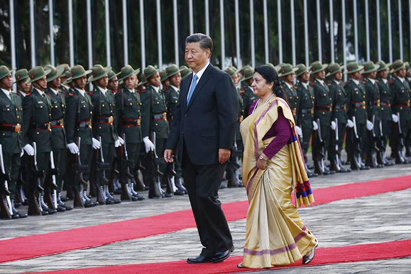 President Bidya Devi Bhandari welcomes and accompanies her Chinese counterpart Xi Jinping along the red carpet while a squad from Nepal Army forms guard of honour at Tribhuvan International Airport, Kathmandu, on Saturday, October 12, 2019. The Chinese President is on a two-day state visit to Nepal at the invitation of his Nepalese counterpart Bidhya Devi Bhandari. This is the visit of a Chinese President to Nepal in the gap of 23 years.