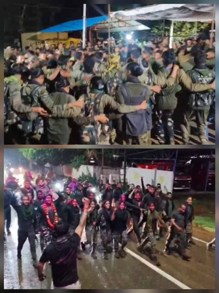 छत्तीसगढ़ के सबसे दुर्गम एवं नक्सल प्रभावित क्षेत्र नारायणपुर के अबूझमाड़ के गोटेर से डीआरजी के वीर जवानों का देररात बरसात के बीच नारायणपुर जिला मुख्यालय में लोगों ने भव्य स्वागत किया। जवानों की आरती उतारी गई। रंग-गुलाल लगाने के पुष्पवर्षा की गई। ऐसा लगा मानो शहर में दिवाली से पहले ही रोशनी और उत्साह का पर्व आ गया हो। इस स्वागत काे देखकर जवान भी देर रात बरसते पानी में जमकर नाचे।