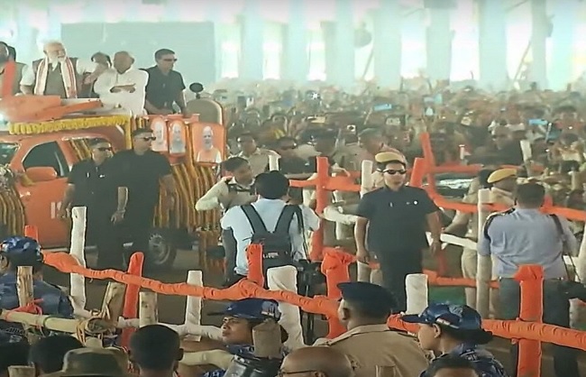 प्रधानमंत्री नरेन्द्र मोदी दो दिवसीय बिहार दौरे के दूसरे दिन आज रोहतास जिले के बिक्रमगंज में जनसभा कर रहे हैं। प्रधानमंत्री मोदी, नीतीश कुमार और सम्राट चौधरी के साथ खुली जीप में सवार होकर मंच तक पहुंचे। मंच पर प्रधानमंत्री नरेन्द्र मोदी का मधुबनी चित्रकला से बनाई गई शॉल ओढ़ाकर अभिनंदन किया गया। मंच पर राज्यपाल आरिफ मोहम्मद खान, मुख्यमंत्री नीतीश कुमार समेत भाजपा एवं राजग के कई नेता मौजूद हैं।