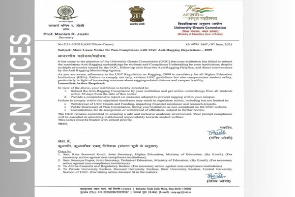 यूजीसी ने उन संस्थानों को निर्देश दिया है जो छात्रों द्वारा अनिवार्य एंटी-रैगिंग अंडरटेकिंग और अनुपालन अंडरटेकिंग प्रस्तुत करने में विफल रहे हैं, वे 30 दिनों के भीतर एंटी-रैगिंग अनुपालन प्रस्तुत करें और सभी छात्रों से ऑनलाइन अंडरटेकिंग प्राप्त करें। इसने इन संस्थानों से परिसर के भीतर रैगिंग को रोकने के लिए अपनाए गए उपायों पर एक व्यापक रिपोर्ट प्रदान करने को कहा है। यूजीसी ने चेतावनी दी है कि निर्धारित समय सीमा के भीतर अनुपालन न करने पर नियामक कार्रवाई हो सकती है, जिसमें यूजीसी अनुदान और फंडिंग वापस लेना भी शामिल है। अनुपालन न करने पर गैर-अनुपालन का सार्वजनिक प्रकटीकरण भी होगा, और मान्यता रद्द करने या संबद्धता वापस लेने पर विचार किया जाएगा, जो आगे की समीक्षा के अधीन होगा।
