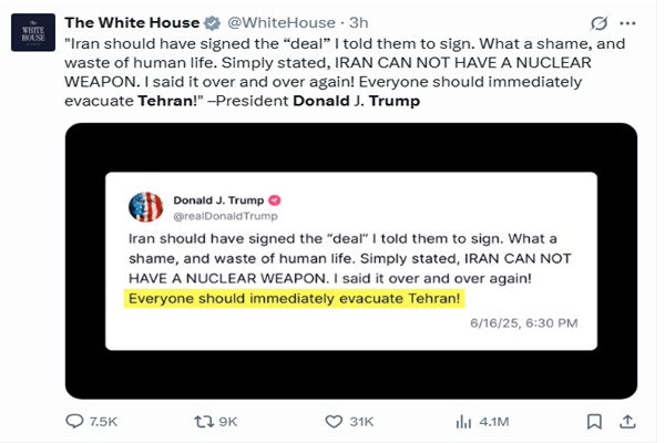 अमेरिकी राष्ट्रपति डोनाल्ड ट्रंप ने ईरान और इजरायल के बीच बढ़ते तनाव के बीच सभी से तेहरान को तुरंत खाली करने का आग्रह किया है। हालांकि, अमेरिकी राष्ट्रपति ने विस्तार से नहीं बताया। ईरानी राजधानी में लगभग 10 मिलियन लोग रहते हैं। ट्रंप ने ट्रुथ सोशल पर लिखा कि ईरान के पास परमाणु हथियार नहीं हो सकता। व्हाइट हाउस के एक अधिकारी ने कहा कि राष्ट्रपति ट्रंप का ईरानियों से तेहरान को तुरंत खाली करने का आह्वान ईरान के लिए कूटनीतिक वार्ता में प्रवेश करने की तत्काल आवश्यकता को दर्शाता है। व्हाइट हाउस ने घोषणा की है कि इजरायल और ईरान के बीच बढ़ते संघर्ष के कारण अमेरिकी राष्ट्रपति कनाडा की अपनी G7 यात्रा को छोटा कर देंगे।