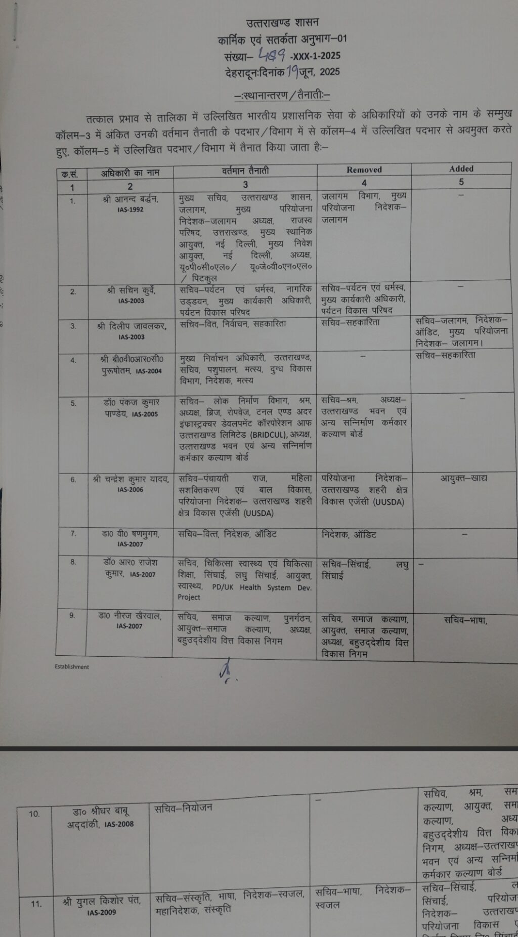 संयुक्त सचिव राजेन्द्र सिंह की ओर से जारी स्थानांतरण आदेश में मुख्य सचिव आनंद बर्द्धन से जलागम विभाग का मुख्य परियोजना निदेशक जलागम हटा लिया गया है। सचिन कुर्वे से सचिव पर्यटन एवं धर्मस्व, मुख्य कार्यकारी अधिकारी पर्यटन विकास परिषद को बदल कर धीरज सिंह गर्ब्याल को यह जिम्मेदारी दी गई है। बीवीआरसी पुरषोत्तम से सचिव सहकारिता बदलकर दिलीप जावलकर सचिव सहकारिता के साथ सचिव जलागम निदेशक,आडिट मुख्य परियोजना निदेशक जलागम का दायित्व सौंपा गया है। डॉ पंकज पाण्डेय से सचिव-श्रम, उत्तराखण्ड भवन एवं अन्य सन्निर्माण कर्मकार कल्याण बोर्ड