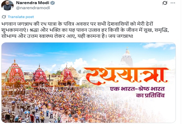 प्रधानमंत्री नरेंद्र मोदी ने भगवान जगन्नाथ की पावन रथ यात्रा के अवसर पर देशवासियों को हार्दिक बधाई दी। अपने सोशल मीडिया पोस्ट में उन्होंने कहा कि यह आस्था और भक्ति का पर्व सभी के लिए सुख, समृद्धि, सौभाग्य और उत्तम स्वास्थ्य लेकर आए। उन्होंने सभी नागरिकों के उज्जवल भविष्य और खुशहाल जीवन की कामना की।