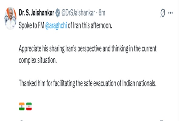 विदेश मंत्री डॉ. एस. जयशंकर ने आज ईरान के विदेश मंत्री सैयद अब्बास अराघची से ईरान की मौजूदा स्थिति पर बात की। सोशल मीडिया पर पोस्ट में डॉ. जयशंकर ने कहा कि वे मौजूदा जटिल स्थिति में ईरान के दृष्टिकोण और सोच को साझा करने के लिए उनके आभारी हैं। उन्होंने भारतीय नागरिकों को सुरक्षित निकालने में मदद करने के लिए ईरानी विदेश मंत्री को धन्यवाद भी दिया।