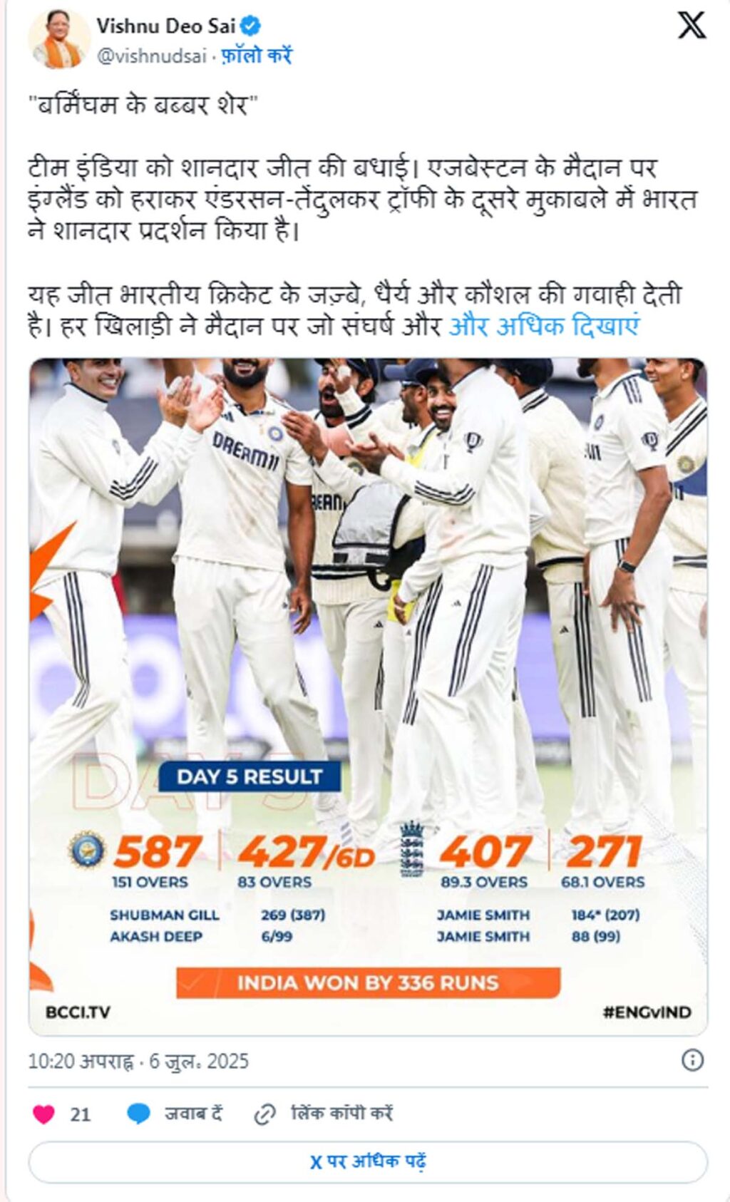 रायपुर 7 जुलाई । बर्मिंघम के एजबेस्टन ग्राउंड में खेले गए दूसरे टेस्ट मैच में भारतीय क्रिकेट टीम ने इंग्लैंड को 336 रन से हराया। इसके साथ ही पांच मैचों की सीरीज 1-1 से बराबर हो गई है। भारत की जीत पर छत्तीसगढ़ के मुख्यमंत्री विष्णुदेव साय ने बीती देर रात ट्वीट कर टीम इंडिया को शानदार जीत की बधाई दी है।