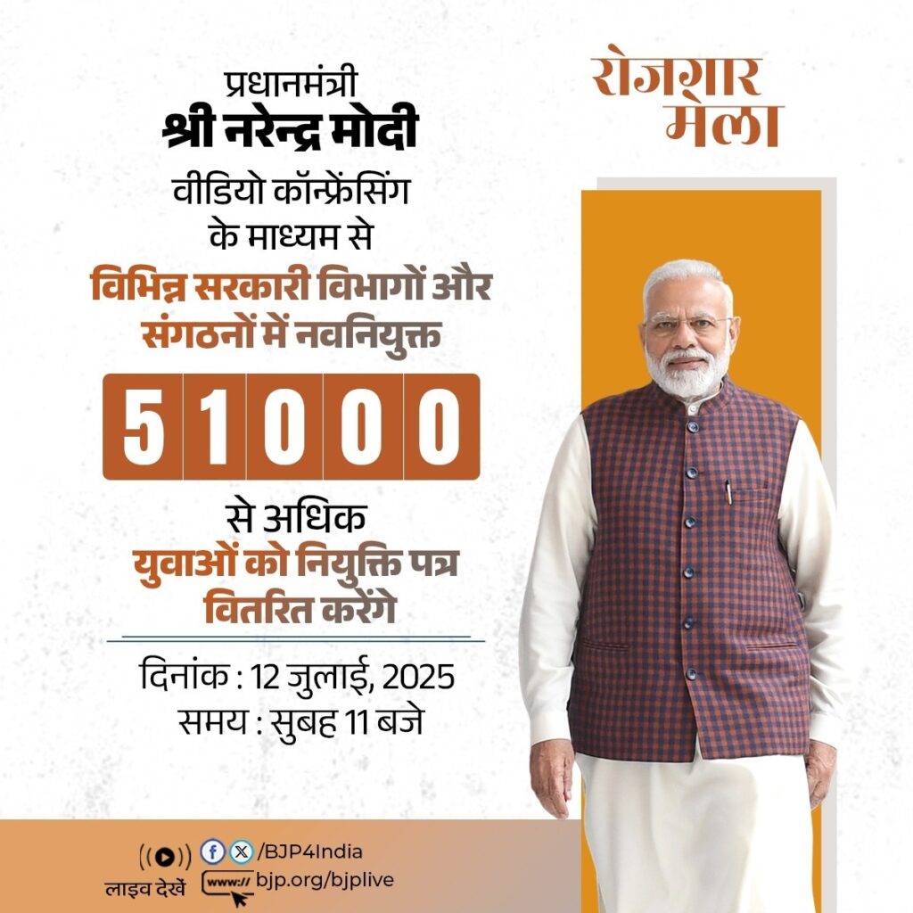 पीआईबी की विज्ञप्ति के अनुसार, प्रधानमंत्री मोदी आज सुबह लगभग 11 बजे वीडियो कॉन्फ्रेंसिंग के माध्यम से विभिन्न सरकारी विभागों और संगठनों में नवनियुक्त 51,000 से अधिक युवाओं को नियुक्ति पत्र वितरित करने के साथ उन्हें संबोधित भी करेंगे। विज्ञप्ति में कहा गया है कि रोजगार मेला, रोजगार सृजन को सर्वोच्च प्राथमिकता देने की प्रधानमंत्री की प्रतिबद्धता को पूर्ण करने की दिशा में बड़ी पहल है।