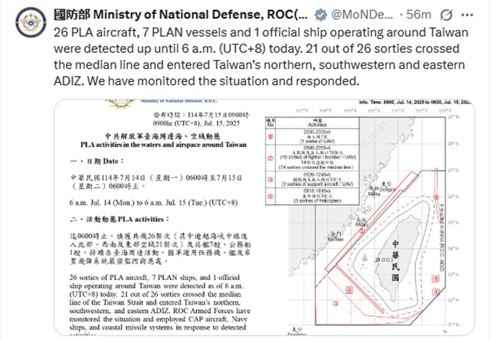 ताइवान के राष्ट्रीय रक्षा मंत्रालय के अनुसार, चीन के 26 सैन्य विमानों में से 21 ने मध्य रेखा पार करके ताइवान के उत्तरी, दक्षिण-पश्चिमी और पूर्वी वायु रक्षा क्षेत्र में प्रवेश किया। ताइवान के सशस्त्र बलों ने माकूल जवाब देने के लिए अपने विमान, नौसैनिक जहाज और तटीय मिसाइल प्रणालियां तैनात कीं। एक अन्य एक्स पोस्ट में रक्षा मंत्रालय ने कहा कि सशस्त्र बलों ने रात्रिकालीन रन-वे मरम्मत अभ्यास किया। साथ ही दूरस्थ द्वीपों पर सैनिकों ने आपातकालीन प्रतिक्रिया क्षमता को बढ़ाने के लिए भोर में लाइव फायर अभ्यास किया।