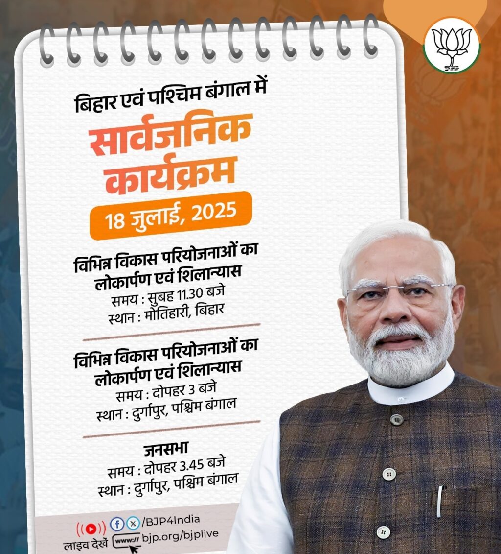 नई दिल्ली, 18 जुलाई। प्रधानमंत्री नरेन्द्र मोदी आज देश के दो राज्यों बिहार और पश्चिम बंगाल का दौरा करेंगे। वो सबसे पहले सुबह लगभग 11:30 बजे बिहार के मोतिहारी जिले में 7,200 करोड़ रुपये से अधिक की विभिन्न विकास परियोजनाओं का शिलान्यास और उद्घाटन करेंगे। इसके बाद प्रधानमंत्री मोदी पश्चिम बंगाल जाएंगे। वो दोपहर लगभग तीन बजे दुर्गापुर में 5000 करोड़ रुपये से अधिक की विभिन्न विकास परियोजनाओं का शिलान्यास और उद्घाटन करेंगे। प्रधानमंत्री दोनों राज्यों में जनसभा को भी संबोधित करेंगे। यह जानकारी भारत सरकार के पत्र एवं सूचना कार्यालय (पीआईबी) ने प्रधानमंत्री के दौरे की पूर्व संध्या पर जारी विज्ञप्ति में दी। भारतीय जनता पार्टी (भाजपा) ने भी प्रधानमंत्री मोदी के आज कार्यक्रम को अपने एक्स हैंडल पर साझा किया है।