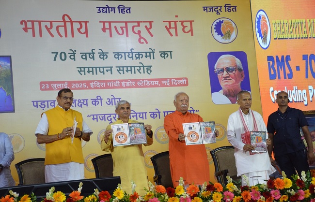 नई दिल्ली, 23 जुलाई । राष्ट्रीय स्वयंसेवक संघ के सरसंघचालक डॉ. मोहन भागवत ने बुधवार को कहा कि टेक्नोलॉजी के इस दौर में समाज और श्रम बाजार पर नई टेक्नोलॉजी के प्रभाव का आकलन जरूरी है। उन्होंने कहा कि श्रमिकों के जीवन पर टेक्नोलॉजी के प्रभाव को लेकर विचार करना चाहिए। मजदूरों का दुःख समाज का दुःख है। टेक्नोलॉजी मनुष्य का स्वभाव रूखा बनाती है और परिश्रम की प्रतिष्ठा पर प्रश्नचिह्न भी लगाती है। इन सब बातों पर विचार जरूरी है। डॉ. भागवत ने नई दिल्ली के इंदिरा गांधी इंडोर स्टेडियम में भारतीय मजदूर संघ (बीएमएस) की 70वीं वर्षगांठ के कार्यक्रम में कहा कि बीएमएस को बड़ा बनाना है। देश के वातावरण में परिवर्तन लाने के साथ-साथ दुनिया के वातावरण में भी बदलाव लाना अपना काम है। संगठन की प्रतिष्ठा बढ़ती है, तो संगठन यशस्वी होता है, कार्यकर्ताओं का मान बढ़ता है। भारतीय मजदूर संघ सिर्फ अपना झंडा खड़ा करने के लिए नहीं, बल्कि श्रमिकों के लिए बनाया गया था।इस अवसर पर केंद्रीय श्रम एवं रोजगार मंत्री डॉ. मनसुख मांडविया ने कहा, “दुनियाभर में अलग-अलग संगठनों के काम करने के अपने-अपने तरीके हैं, लेकिन भारतीय मजदूर संघ अनोखा है। यह भारतीय श्रमिकों, भारतीय लोगों और भारतीय जीवन शैली के आधार पर श्रम क्षेत्र में काम करता है। इसने एक विशिष्ट कार्यशैली और प्रणाली विकसित की है।”बीएमएस के राष्ट्रीय अध्यक्ष हिरन्मय पंड्याजी ने कार्यक्रम की अध्यक्षता की। उन्होंने बताया कि भारतीय मजदूर संघ की यात्रा 23 जुलाई 1955 को भोपाल में शुरू हुई थी। बीएमएस ने अपनी स्थापना का 70वां वर्षगाठ मनाने की शुरुआत भोपाल से की थी, जिसका समापन आज हो रहा है। उन्होंने कहा कि भारतीय मजदूर संघ ने अपनी भूमिका केवल यहीं तक सीमित नहीं रखी है। इसकी बजाय समाज और विश्व के कल्याण के व्यापक उपाय जैसे पर्यावरण, सामाजिक समरसता एवं स्वदेशी भी उनके प्रमुख लक्ष्यों में से एक है।कार्यक्रम में दिल्ली की मुख्यमंत्री रेखा गुप्ता, कॉर्पोरेट मामलों के केंद्रीय राज्यमंत्री हर्ष मल्होत्रा, दिल्ली सरकार के मंत्री कपिल मिश्रा और प्रवेश वर्मा, दिल्ली विधानसभा अध्यक्ष विजेंद्र गुप्ता, अंतरराष्ट्रीय श्रम संगठन के भारत निदेशक मिचिको मियामोतो, संघ के सह-सरकार्यवाह अरुण कुमार, भाजपा के राष्ट्रीय संगठन महामंत्री बीएल संतोष समेत कई प्रमुख नेता मौजूद रहे।