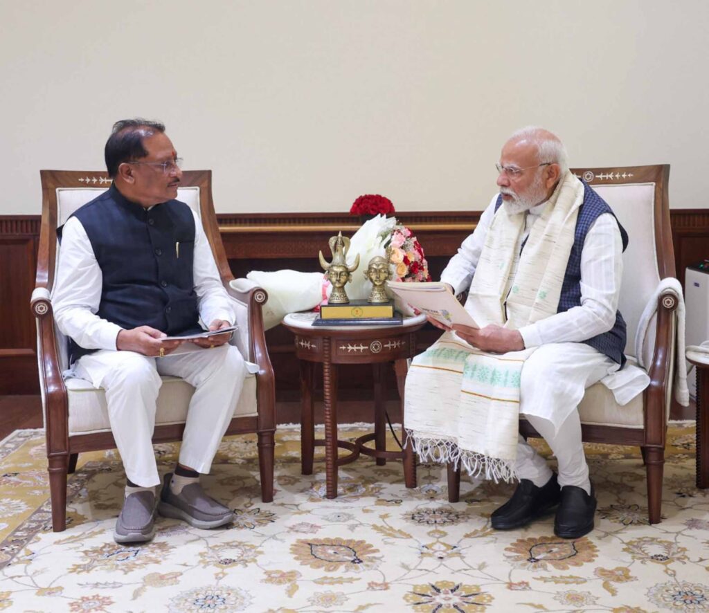 छत्तीसगढ़ के मुख्यमंत्री विष्णुदेव साय दिल्ली दाैरे पर हैं। मुख्यमंत्री ने अपने दाैरे के तीसरे दिन शुक्रवार काे संसद भवन में प्रधानमंत्री नरेन्द्र मोदी से सौजन्य भेंट की। उन्होंने प्रधानमंत्री को 01 नवंबर 2025 को रायपुर में आयोजित अमृत रजत महोत्सव में मुख्य अतिथि के रूप में शामिल होने को आमंत्रित किया। साथ ही मुख्यमंत्री ने प्रधानमंत्री को राज्य सरकार की भावी योजनाओं, विकास की प्राथमिकताओं और जनकल्याण से जुड़े प्रमुख विषयों की जानकारी भी दी।
