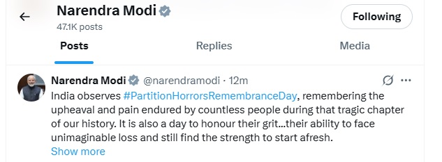 प्रधानमंत्री मोदी ने आज ‘विभाजन विभीषिका स्मृति दिवस’ के मौके पर अपने आधिकारिक एक्स हैंडल पर लिखा, “भारत विभाजन विभीषिका स्मृति दिवस मनाता है और हमारे इतिहास के उस दुखद अध्याय के दौरान अनगिनत लोगों द्वारा झेली पीड़ा को याद करता है। यह उनके धैर्य, अकल्पनीय क्षति का सामना करने और फिर भी नए सिरे से शुरुआत करने की ताकत पाने की उनकी क्षमता का सम्मान करने का भी दिन है।”