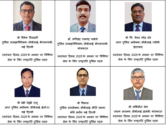 राष्ट्रपति पुलिस पदक पाने वालों में विवेक प्रियदर्शी (पुलिस उप महानिरीक्षक, बीएसएफबी, नई दिल्ली), मच्छिंद्र रामचंद्र कडोले (पुलिस उप महानिरीक्षक, बीएसएफबी, कोलकाता), चि. वेंकट नरेंद्र देवे (अपर पुलिस अधीक्षक, एसीबी, हैदराबाद), बंडी पेड्डी राजू (अपर पुलिस अधीक्षक, ईओ-III, नई दिल्ली), विशाल (पुलिस उपाधीक्षक, नीति प्रभाग, नई दिल्ली) और अभिजीत सेन (प्रधान आरक्षक, ईओबी, कोलकाता) शामिल हैं।