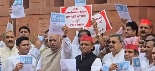 सभी नेताओं ने हाथों में बैनर-पोस्टर लेकर प्रदर्शन किया, जिन पर “एसआईआर वापस लो” और “वोट चोरी रोको” जैसे नारे लिखे थे। प्रदर्शन के दौरान सांसदों ने चुनाव आयोग के खिलाफ नारेबाजी की और बिहार में एसआईआर को तत्काल रोकने की मांग की।