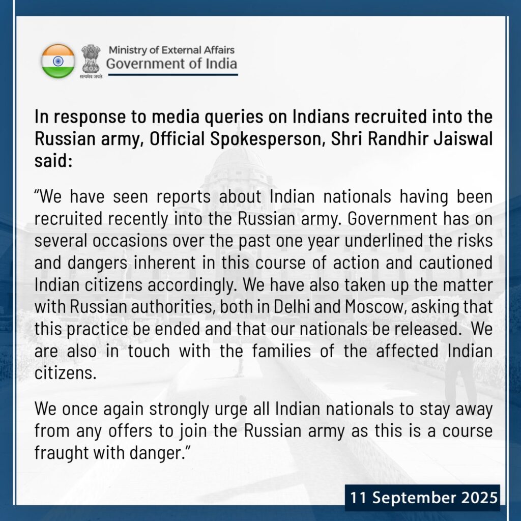 सरकार ने आज सभी भारतीय नागरिकों से रूसी सेना में शामिल होने के किसी भी प्रस्ताव से दूर रहने का आग्रह किया और इसे ख़तरों से भरा बताया। मीडिया के सवालों के जवाब में, विदेश मंत्रालय के प्रवक्ता रणधीर जायसवाल ने कहा कि ऐसी खबरें हैं कि हाल ही में भारतीय नागरिकों को रूसी सेना में भर्ती किया गया है। उन्होंने ज़ोर देकर कहा कि सरकार ने पिछले एक साल में इस तरह की कार्रवाई में निहित जोखिमों और ख़तरों को रेखांकित किया है और नागरिकों को तदनुसार आगाह किया है। श्री जायसवाल ने आगे बताया कि सरकार ने दिल्ली और मॉस्को दोनों जगहों पर रूसी अधिकारियों के साथ इस मामले को उठाया है और इस प्रथा को रोकने और भारतीय नागरिकों को रिहा करने का अनुरोध किया है। श्री जायसवाल ने आश्वासन दिया कि सरकार प्रभावित भारतीय नागरिकों के परिवारों के संपर्क में है।