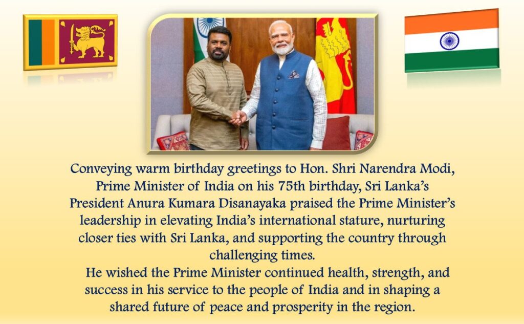 भारतीय प्रधानमंत्री नरेंद्र मोदी के 75वें जन्मदिन के उपलक्ष्य में श्रीलंका भर में विशेष प्रार्थनाएँ आयोजित की जा रही हैं, जो विभिन्न धर्मों और समुदायों के बीच सद्भावना को दर्शाती हैं। कोलंबो स्थित बोहरा समुदाय अपनी हुसैनी मस्जिद में प्रार्थना का आयोजन कर रहा है, जिसमें मोदी के स्वास्थ्य और निरंतर नेतृत्व के लिए दुआएँ मांगी जा रही हैं। कोलंबो स्थित महाबोधि सोसाइटी में भी प्रार्थनाएँ आयोजित की जा रही हैं, जहाँ भिक्षु धम्म से आशीर्वाद प्राप्त करेंगे।