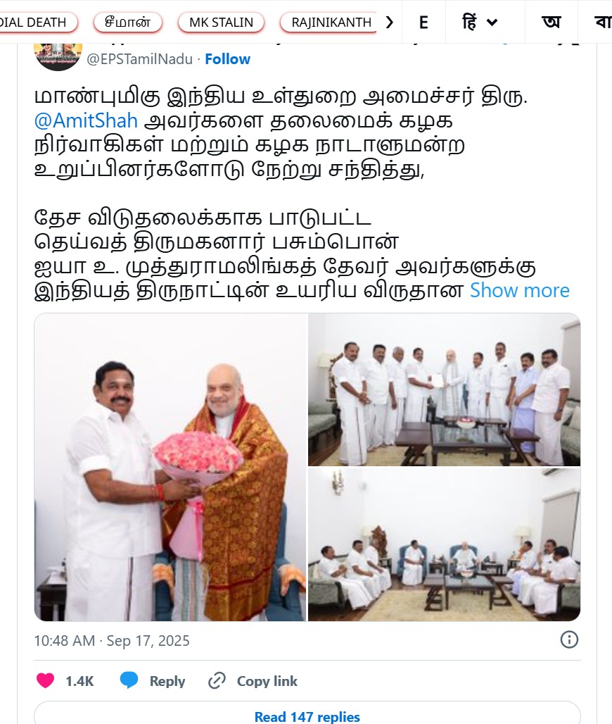 एआईडीएमके महासचिव ने सोशल माडिया एक्स पर एक पोस्ट कर के कहा, “कल मैंने पार्टी नेताओं और सांसदों के साथ गृहमंत्री अमित शाह से मुलाकात की और अन्नाद्रमुक की ओर से एक पत्र सौंपा, जिसमें देश की आज़ादी में अहम योगदान देने वाले पसुम्पोन अय्या यू. मुथुरामलिंगम थेवर को देश के सर्वोच्च सम्मान, भारत रत्न से सम्मानित करने की मांग की गई है।”