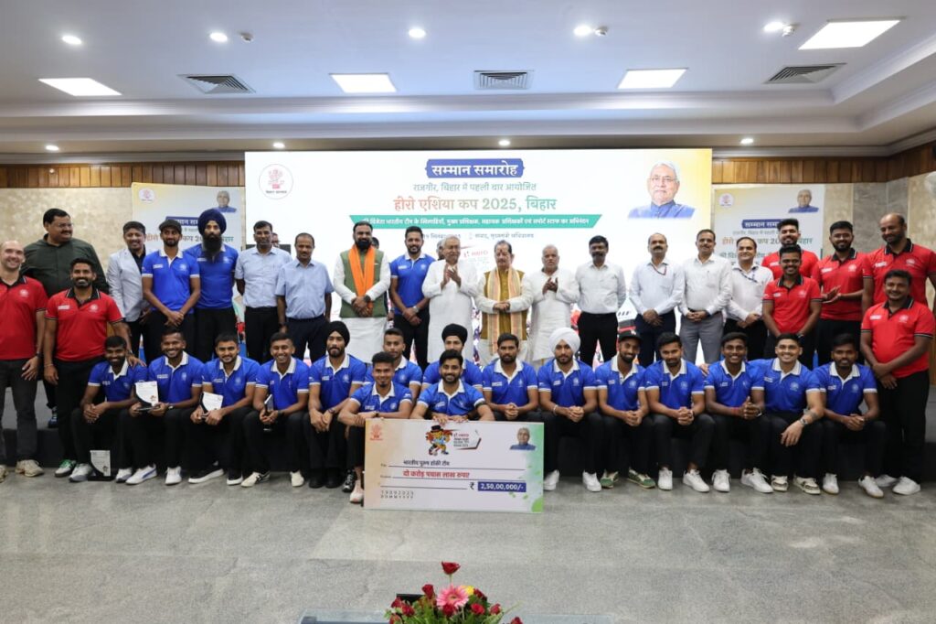 नीतीश कुमार ने मुख्यमंत्री सचिवालय स्थित ‘संवाद’ में आयोजित सम्मान समारोह में हीरो एशिया कप, 2025 की विजेता भारतीय टीम के खिलाड़ियों, मुख्य प्रशिक्षक, सहायक प्रशिक्षकों को 10-10 लाख रुपये, जबकि सपोर्टिंग स्टाफ को 5-5 लाख रुपये की सम्मान राशि एवं प्रशस्ति पत्र देकर सम्मानित किया।