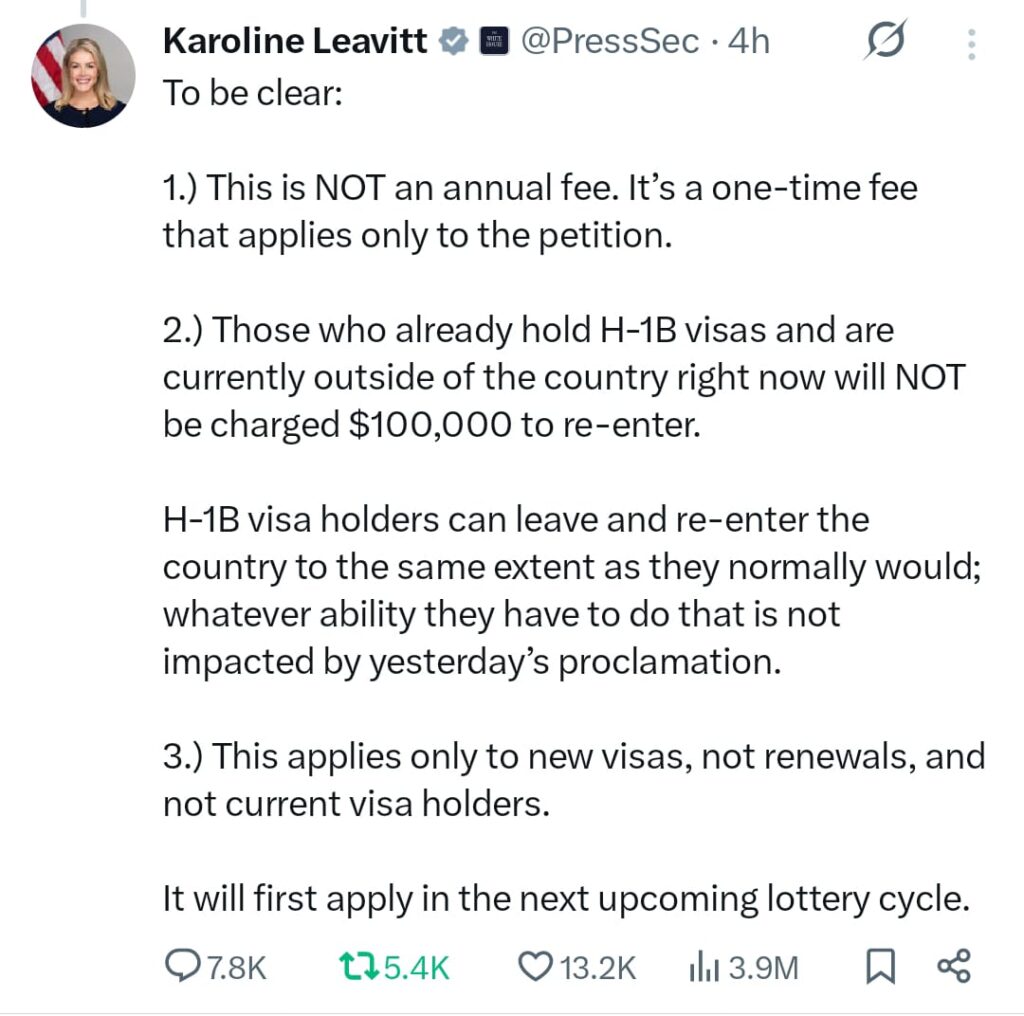 व्हाइट हाउस की प्रेस सचिव कैरोलाइन लेविट ने शनिवार को साफ किया कि हाल ही में घोषित एक लाख डॉलर का एच-1बी वीजा शुल्क वार्षिक नहीं है। यह एकमुश्त शुल्क है जो केवल नये एच-1बी आवेदन पर लागू होगा। नवीनीकरण कराने या वर्तमान वीजा धारकों पर यह लागू नहीं होगा।
