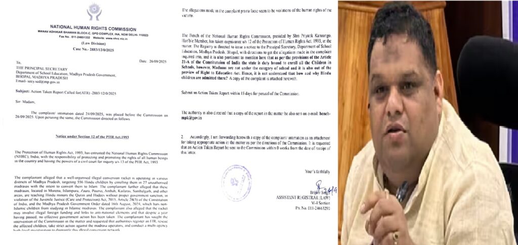 भोपाल, 30 सितंबर। मध्य प्रदेश में अवैध मदरसों के संचालन का मुद्दा एक बार फिर सुर्खियों में है। राष्ट्रीय मानव अधिकार आयोग (एनएचआरसी) ने प्रदेश में बड़ी संख्या में हिंदू बच्चों के वैध और अवैध मदरसों में दाखिले को लेकर संज्ञान लिया है। इस संबंध में आयोग ने राज्य के स्कूल शिक्षा विभाग के प्रमुख सचिव को नोटिस जारी करते हुए 15 दिन के भीतर विस्तृत एक्शन टेकन रिपोर्ट (एटीआर) मांगी है।