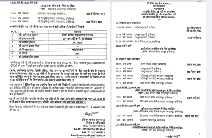 केंद्रीय गृह मंत्री शाह डेढ़ बजे से ढाई बजे तक सेवा पखवाड़ा अंतर्गत स्वदेशी प्रदर्शनी में शामिल होंगे। फिर वे सवा तीन बजे जगदलपुर से रवाना हो जाएंगे।