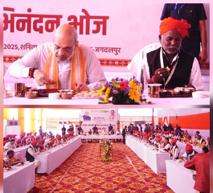 जगदलपुर, 4 अक्टूबर। केंद्रीय गृहमंत्री अमित शाह, मुख्यमंत्री विष्णु देव साय और उप मुख्यमंत्री विजय शर्मा ने लालबाग में आयोजित कार्यक्रम के उपरांत बस्तर दशहरा के विभिन्न रस्माें के निर्वहन में शामिल मांझी, चालकी, मेम्बर, मेबरीन के साथ अभिनंदन भोज किया।