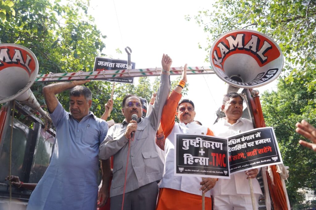 नई दिल्ली। भारतीय जनता पार्टी (भाजपा) ने पश्चिम बंगाल में हुई हिंसा के विरोध में आज यहां के बंग भवन के सामने प्रदर्शन किया। प्रदर्शन का नेतृत्व दिल्ली भाजपा के अध्यक्ष वीरेंद्र सचदेवा ने किया। भाजपा नेताओं ने मुख्यमंत्री ममता बनर्जी के इस्तीफे की मांग की।