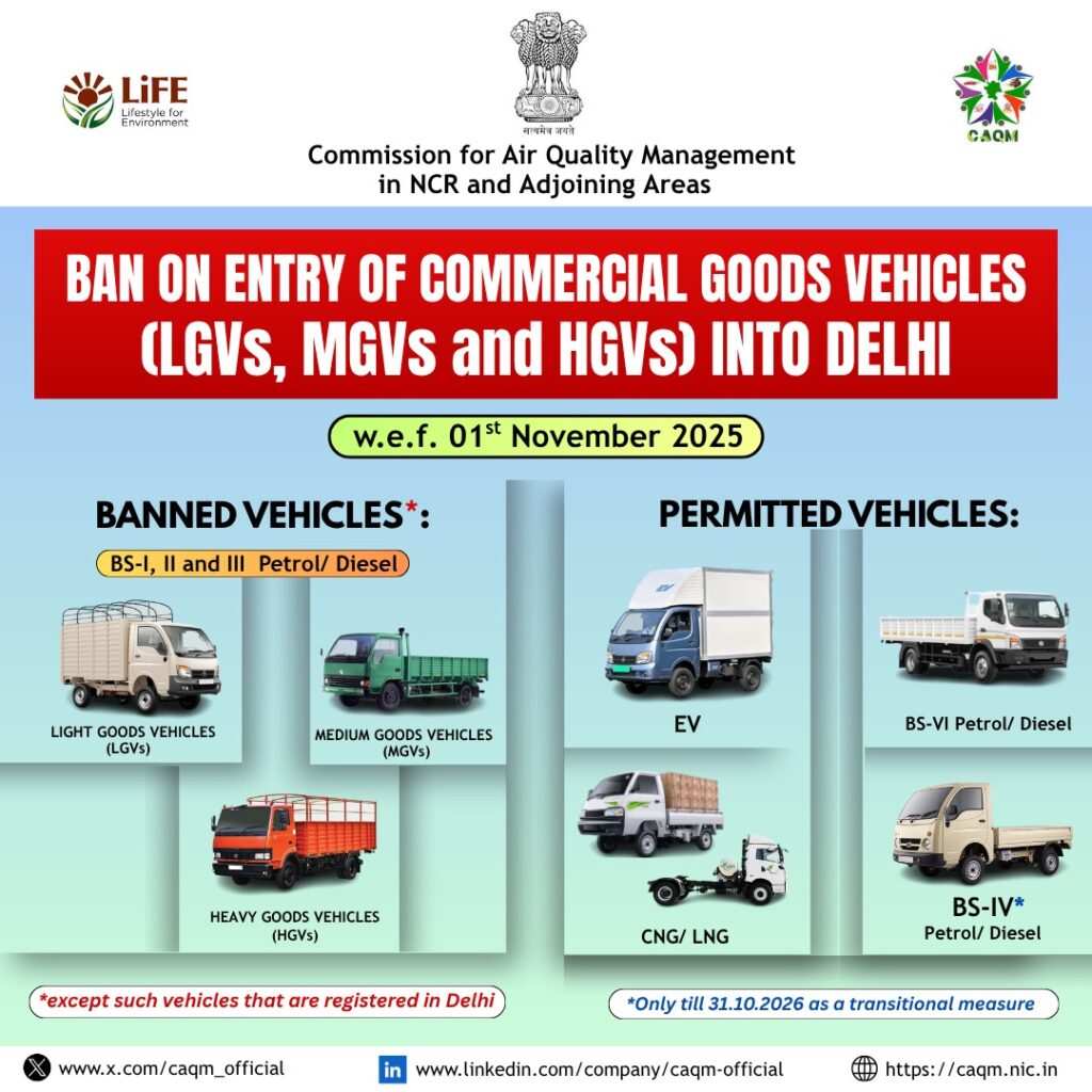 दिल्ली के बाहर पंजीकृत सभी वाणिज्यिक मालवाहक वाहन-जैसे हल्के, मध्यम और भारी मालवाहक वाहन-यदि बीएस-6 मानकों का पालन नहीं करते हैं तो उन्हें दिल्ली में प्रवेश की अनुमति नहीं मिलेगी। हालांकि बीएस-4 डीजल वाहनों को सीमित अवधि के लिए राहत दी गई है। ऐसे वाहन 31 अक्टूबर 2026 तक दिल्ली में प्रवेश कर सकेंगे। इसके बाद उन पर भी रोक लागू हो जाएगी।