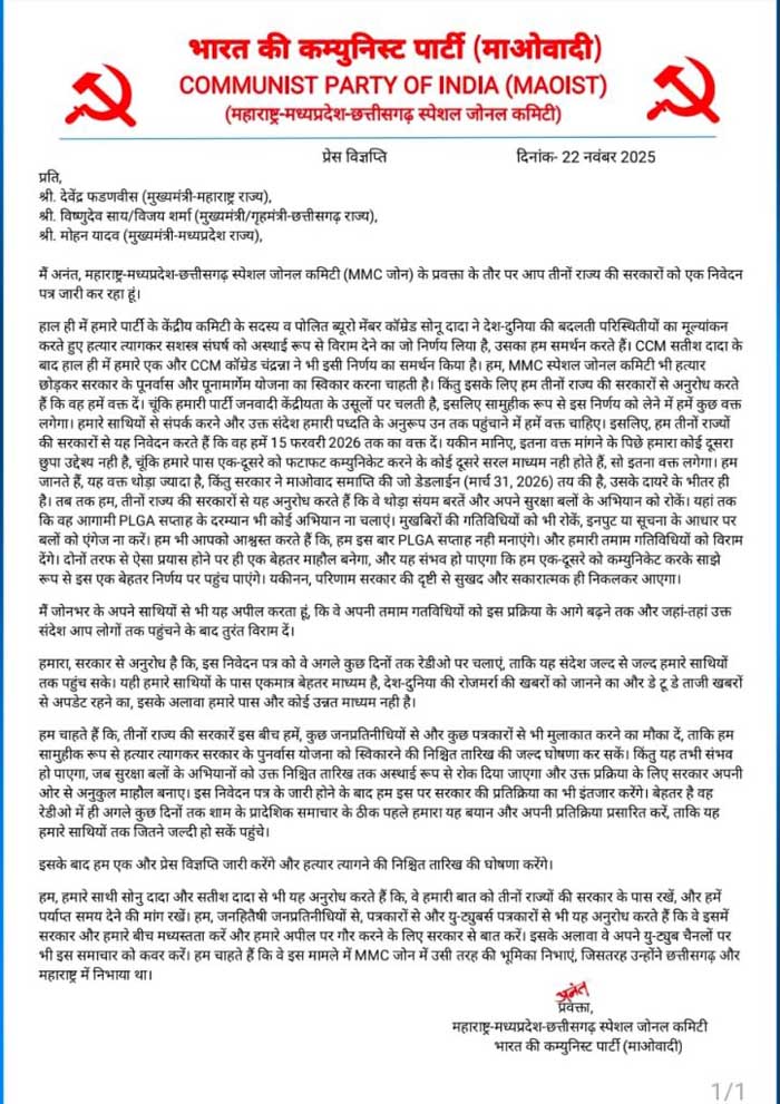 उल्लेखनीय है कि, केंद्रीय कमेटी के सदस्य व पोलित ब्यूरो मेंबर कॉमरेड सोनू दादा ने महाराष्ट्र, मध्यप्रदेश व छत्तीसगढ़ के मुख्यमंत्री के नाम 22 नवंबर काे एक विज्ञप्ति जारी किया है, इस नक्सली पर्चे की पुष्टि हिन्दुस्थान समाचार नहीं करता है। यह विज्ञप्ति नक्सल प्रवक्ता व महाराष्ट्र, एमपी व छत्तीसगढ़ के जोनल प्रवक्ता अनंत ने जारी किया था। इस विज्ञप्ति में देश-दुनिया की बदलती परिस्थितियों का मूल्यांकन करते हुए सशस्त्र संघर्ष को अस्थाई रूप से विराम देने का निर्णय लिया है, सीसीएम सतीश व एक अन्य कामरेड चंद्रन्ना ने भी इस निर्णय का समर्थन किया है। उन्होंने सरकार के पुनर्वास और पूनामार्गेम योजना को स्वीकार किया है।