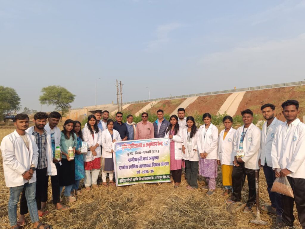 धमतरी, 3 दिसंबर । कृषि महाविद्यालय एवं अनुसंधान केंद्र, कुरुद के चतुर्थ वर्ष के विद्यार्थियों द्वारा ग्रामीण कृषि कार्य अनुभव (रावे) कार्यक्रम के अंतर्गत बुधवार को ग्राम बानगर में चना फसल का प्रयोगात्मक प्लाट आधारित प्रदर्शन सफलतापूर्वक आयोजित किया गया। कुल 10 डिसिमल क्षेत्र में किए गए इस वैज्ञानिक फील्ड-प्रयोग का उद्देश्य किसानों को चना फसल में विभिन्न जैविक एवं रासायनिक बीज उपचार तकनीकों और उनके प्रभावों से अवगत कराना था।