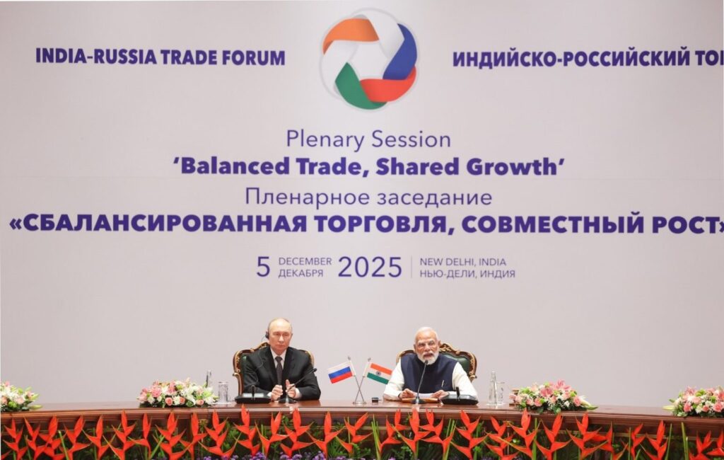 06 दिसंबर। प्रधानमंत्री नरेंद्र मोदी और रूसी राष्ट्रपति व्लादिमीर पुतिन ने शुक्रवार को नई दिल्ली में भारत-रूस व्यापार मंच में भाग लिया। इस कार्यक्रम को संबोधित करते हुए, प्रधानमंत्री ने कहा कि दोनों देश 2030 की मूल समय सीमा से पहले ही अपने 100 अरब डॉलर के व्यापार लक्ष्य को पूरा करने की राह पर हैं