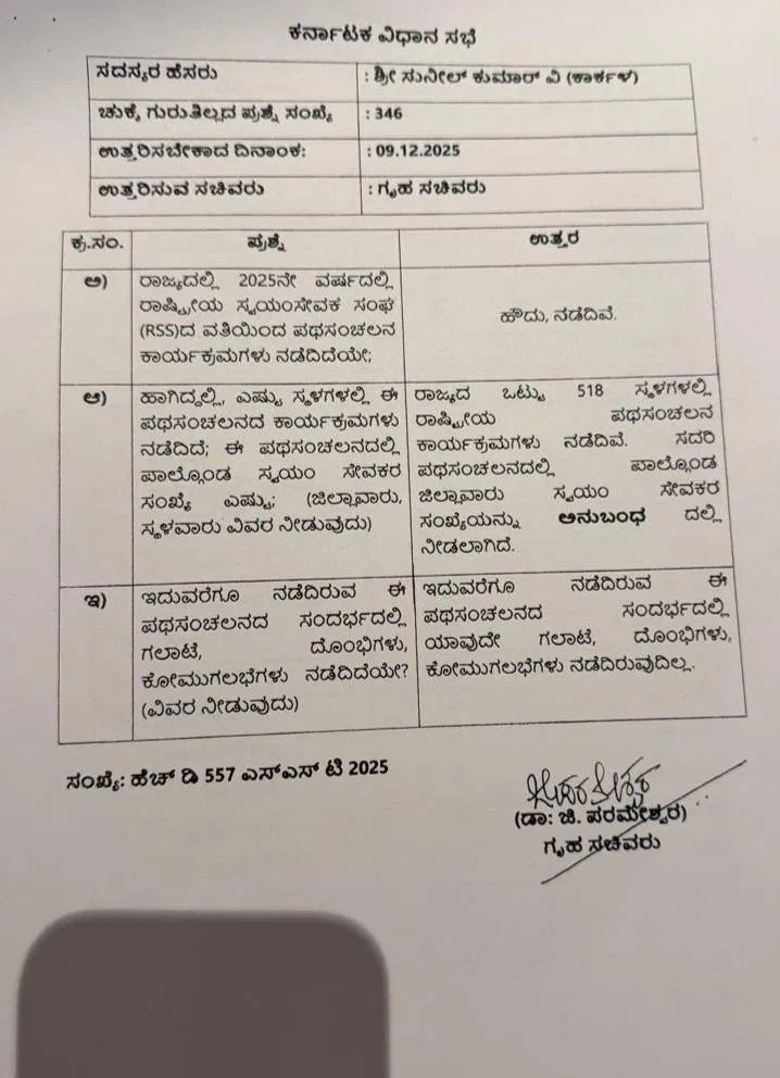 विधानसभा के शीतकालीन सत्र के दौरान भारतीय जनता पार्टी (भाजपा) के विधायक वी. सुनील कुमार की ओर से पूछे गए प्रश्न के लिखित उत्तर में राज्य के गृह मंत्री डॉ. जी. परमेश्वर ने बताया कि इन पथ संचलनों में दो लाख से अधिक स्वयंसेवकों ने भाग लिया, लेकिन इन आयोजनों के दौरान न तो तनाव बढ़ा और न ही किसी प्रकार की सांप्रदायिक अथवा सार्वजनिक अराजकता की स्थिति बनी।