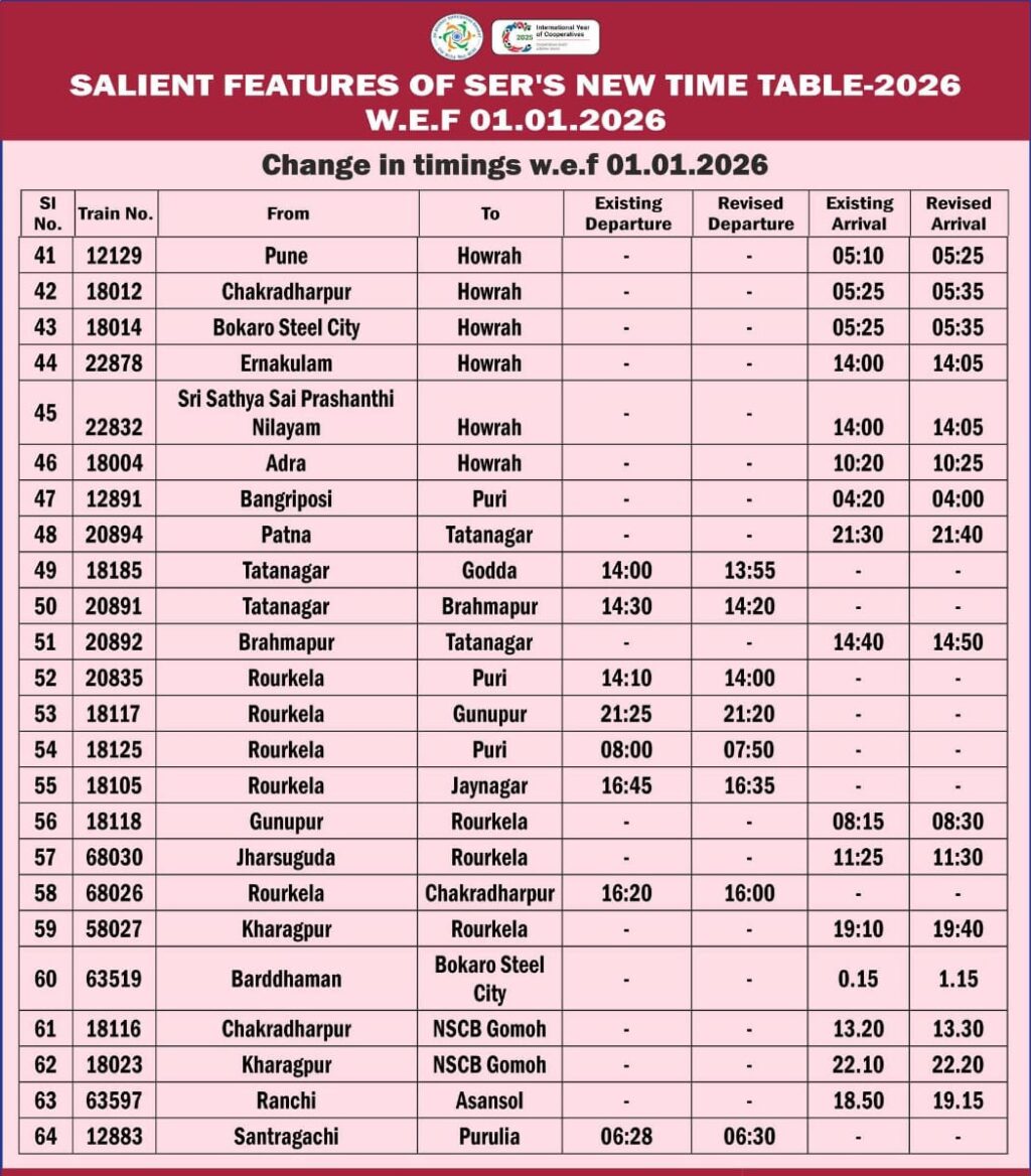 नई समय सारणी में कुल 64 ट्रेनों के प्रस्थान और आगमन समय में बदलाव किया गया है। इनमें हावड़ा, खड़गपुर, रांची, हटिया, टाटानगर, राउरकेला और शालीमार से चलने वाली कई महत्वपूर्ण ट्रेनें शामिल हैं।