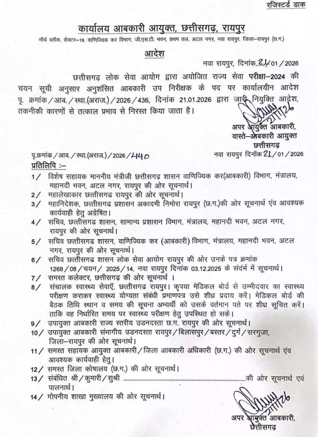 जारी पत्र में कहा गया है कि, “छत्तीसगढ़ लोकसेवा आयोग द्वारा आयोजित राज्य सेवा परीक्षा-2024 की चयन सूची अनुसार अनुशंसित आबकारी उप निरीक्षक पद कार्यालयीन आदेश द्वारा जारी नियुक्ति आदेश तकनीकी कारणों से निरस्त किया जाता है”। दिसंबर 2025 के अंत में आबकारी उपनिरीक्षक के लिए 85 उम्मीदवारों का चयन किया गया था, जिन्हें शारीरिक माप के लिए बुलाया गया था।