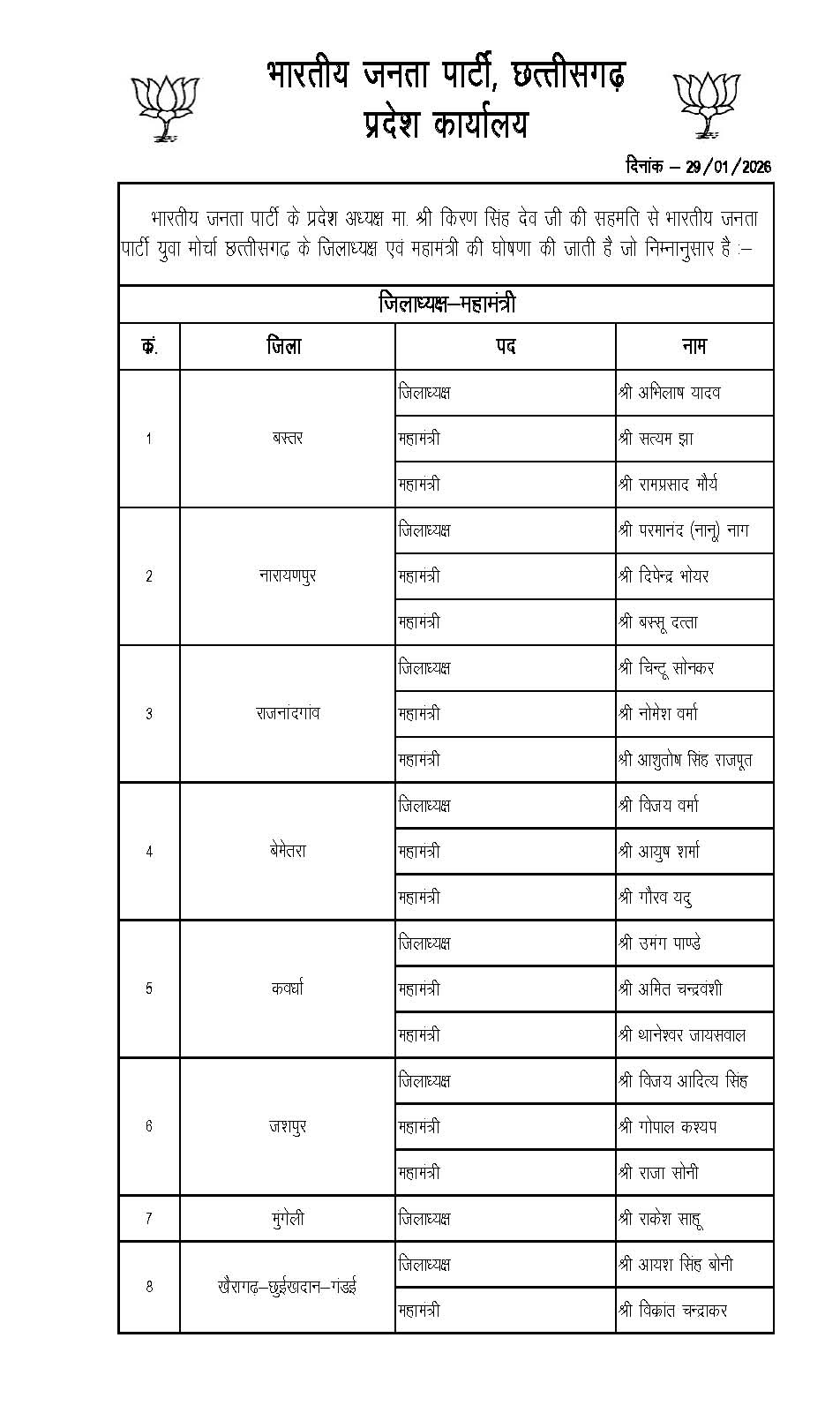 घोषणा सूची में बस्तर, नारायणपुर, राजनांदगांव, खैरागढ़-छुईखदान-गंडई, जशपुर, कवर्धा, बेमेतरा, रायपुर शहर, कोरबा, महासमुंद, गरियाबंद, गौरेला-पेंड्रा-मरवाही सहित कई अन्य जिलों के युवा मोर्चा अध्यक्ष एवं महामंत्रियों के नाम शामिल हैं। प्रदेश भाजपा अध्यक्ष किरण सिंह देव ने नवनियुक्त पदाधिकारियों को संगठनात्मक विस्तार, युवा कार्यकर्ताओं के प्रशिक्षण, केंद्र व राज्य सरकार की जनकल्याणकारी योजनाओं के प्रचार-प्रसार तथा बूथ स्तर तक संगठन को मजबूत करने की महत्वपूर्ण जिम्मेदारियां सौंपी हैं।