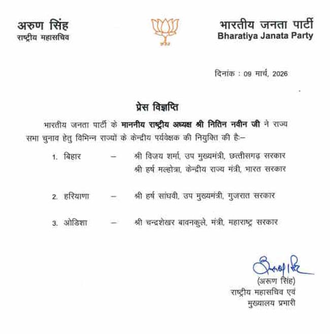 उल्लेखनीय है कि राज्यसभा की रिक्त हो रही 10 राज्यों की 37 सीटों पर 16 मार्च को मतदान होगा। भारतीय जनता पार्टी ने चुनाव के लिए केंद्रीय पर्यवेक्षक नियुक्त किए हैं। इस कड़ी में छत्तीसगढ़ के उप मुख्यमंत्री विजय शर्मा को बिहार का पर्यवेक्षक नियुक्त किया है।