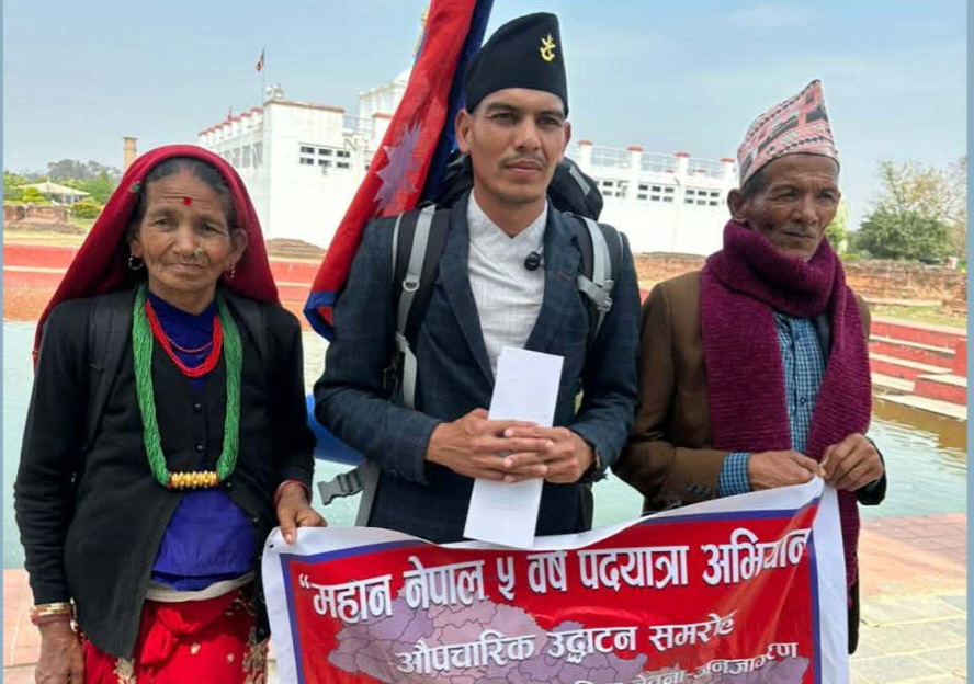 काठमांडू, 20 मार्च । पत्थर और मिट्टी से भरी सड़क, धूप से तपती जमीन और अनिश्चित गंतव्य—इन सबकी परवाह किए बिना नेपाल का एक युवक शुक्रवार से नंगे पांव नेपाल भ्रमण पर निकल पड़ा है। पांच वर्ष तक घर न लौटने के संकल्प के साथ उन्होंने देश के हर भू-भाग को पैदल नापने का अभियान शुरू किया है। दांग जिले के तुलसीपुर नगरपालिका के नवलपुर निवासी 26 वर्षीय मदन केसी ने लुम्बिनी स्थित मायादेवी मंदिर परिसर से ‘महान नेपाल यात्रा’ की औपचारिक शुरुआत की है।